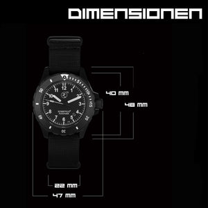 Die BT-25 Black Edition mit Neopren-Armband ist eine leistungsstarke und stylische Taucheruhr für alle Einsätze. Sie vereint stoische Robustheit – dank 500 m Wasserdichtigkeit und verschraubten Bauteilen – mit Nachtablesbarkeit durch Tritiumbeleuchtung. Das Neoprenband ergänzt die technische Seite durch Komfort unter Wasser. Für alle, die Qualität mit urbanem, dezenterem Look verbinden wollen, ist dieses Modell eine ausgezeichnete Wahl.