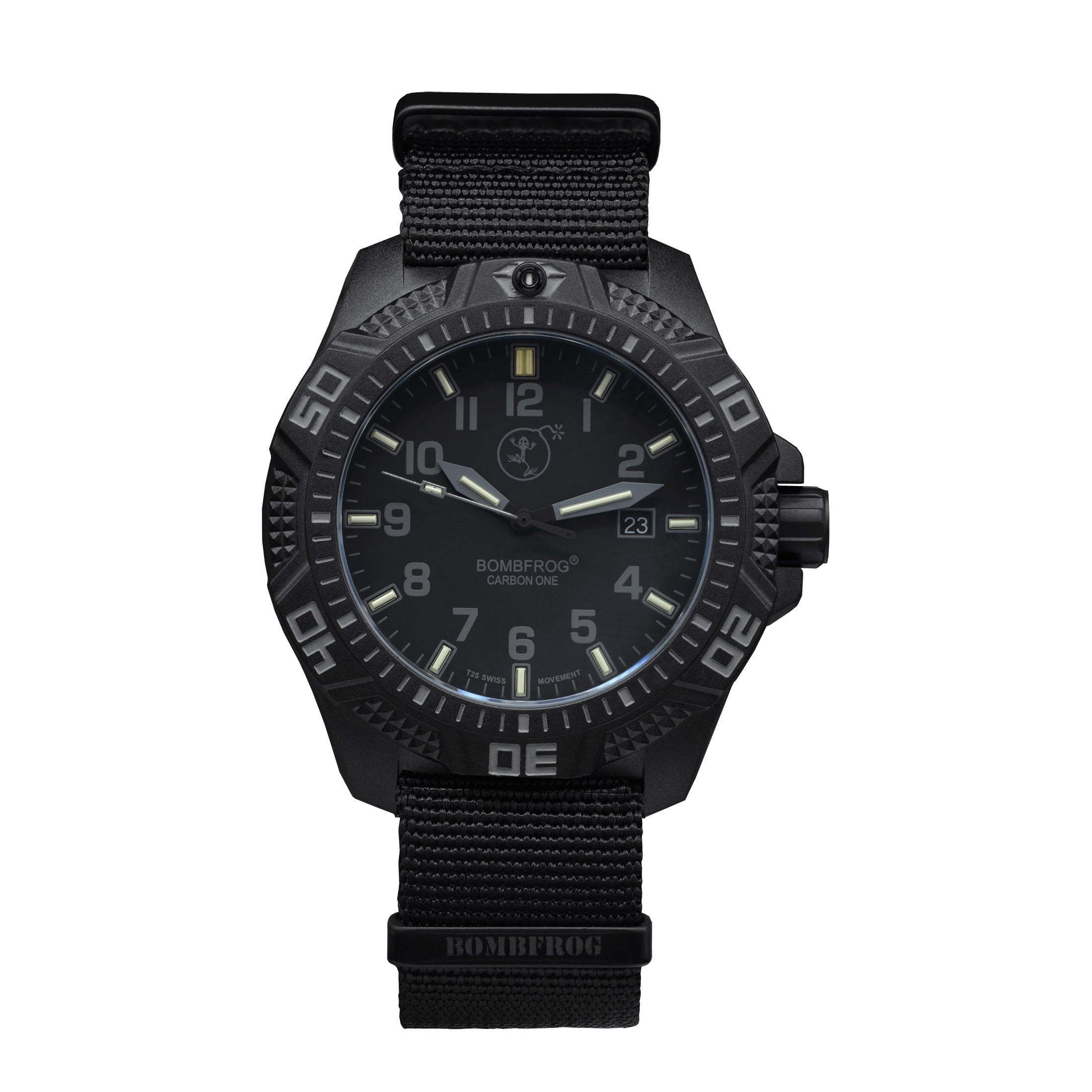 Die Carbon One mit NATO-Armband verkörpert Leichtigkeit, taktische Funktion und markantes Design in einem. Das Gehäuse aus ultraleichtem Polycarbonat kombiniert mit einem schwarzen IP-beschichteten Edelstahlboden schützt das präzise Schweizer Quarzwerk. Das aufgeräumte Zifferblatt sorgt für klare Lesbarkeit, auch dank der H3-Tritiumbeleuchtung, die eine permanente Ablesbarkeit bei Dunkelheit gewährleistet. Das entspiegelte Saphirglas und die einseitig rastbare, verriegelbare Lünette runden die technische Ausstattung ab. Mit einer Wasserdichtigkeit bis 200 Meter ist diese Uhr nicht nur für den Alltag, sondern auch für anspruchsvolle Einsätze bestens gerüstet. Das robuste NATO-Band mit Stegbreite 22 mm sorgt für sicheren Halt und ergänzt das militärisch inspirierte Erscheinungsbild ideal.