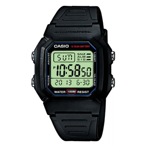 Schnörkellos, mit einem klaren Display, einfacher Bedienung und dem Casio-typischen, nahezu unverwüstbaren Resin-Gehäuse ist die W-800H-1AVES der Casio Collection Men Serie einer der Dauerbrenner bei Casio. Das Kunstharz des Gehäuses, das auch beim Armband mit Dornschliesse verwendet wird, ist unkompliziert und leicht; es wird weder von Hitze und Kälte beeinflusst, noch von Regen. Und wasserfest ist die Uhr ja sowieso: Mit ihrem super robusten und bruchsicheren Acryl-Glas Ziffernblatt wurde die Uhr nach ISO 22810 Standards beurteilt und auf 10 bar wasserdicht eingestuft. Das heisst nicht nur Regen ist kein Problem, sondern die Uhr kann sogar beim Schwimmen oder Schnorcheln eingesetzt werden. Das LED Licht sorgt dabei dafür, dass selbst wenn die Uhr nass ist, oder es dunkel ist, eine klare Anzeige des Displays gesichert ist. Mit einem einfachen Knopfdruck wird die Leuchtdiode aktiviert und das Ziffernblatt erhellt.