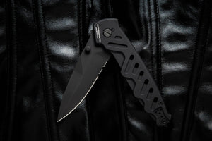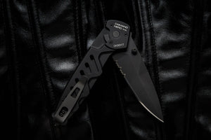Der Griff besteht aus anodisiertem Anticorodal‑Aluminium und wurde ergonomisch gestaltet mit einem Ansatz am Griffende, der eine schnelle Entnahme erleichtert. Eine Glas‑Breaker‑Funktion ist ebenso integriert. Zudem ist die Titan‑Clip‑Befestigung DLC‑beschichtet and in drei Neigungen auf beiden Seiten montierbar – für maximale Flexibilität beim Tragen.