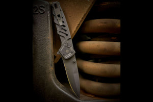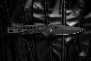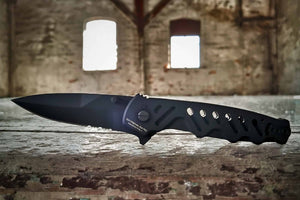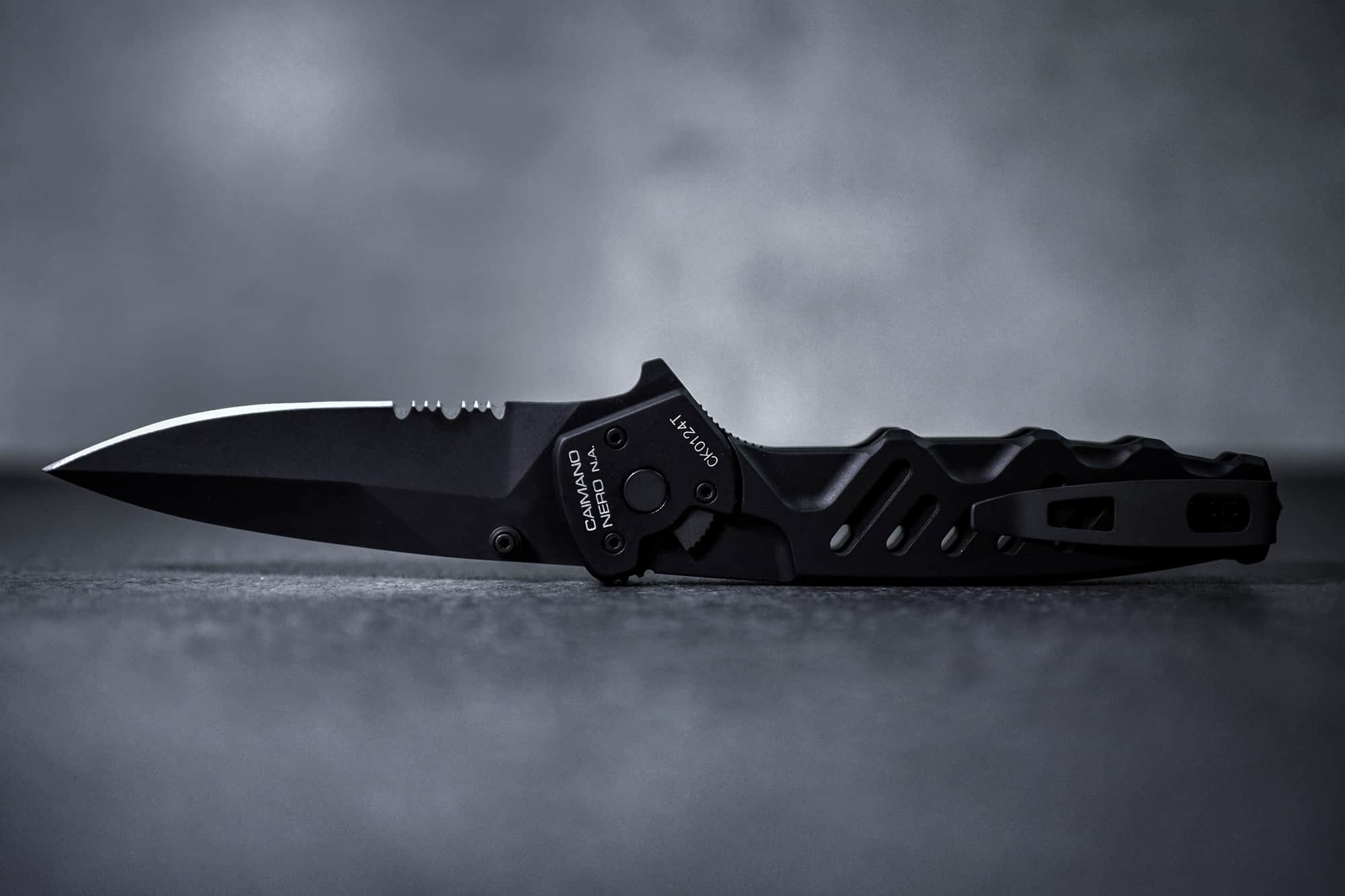 Das Caimano Nero N.A. von Extrema Ratio ist die nicht‑automatische Version eines taktischen Messers, das ursprünglich für den Einsatz durch Eliteeinheiten der italienischen Marine entwickelt wurde. Die rund 93 mm lange Klinge aus Böhler N690‑Stahl (HRC ≈ 58) verfügt über einen asymmetrischen Spear‑Point und eine ca. 20 mm lange Teil‑Serrierung, die es ermöglicht, hochfeste Kabel oder Stoffe zu durchtrennen ohne dabei die Schneide zu beanspruchen.