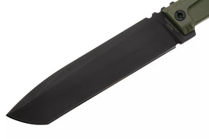 Das Tuscan Green von Extrema Ratio ist ein vielseitiges Einsatzmesser für extreme Bedingungen. Die 167 mm lange Klinge aus Böhler N690‑Stahl (Härte ca. 58 HRC) ist als Vollerl‑Konstruktion ausgeführt und besitzt eine gezielte Gewichtsverlagerung, die das Gewicht auf die Spitze konzentriert – ideal für Hack‑ und Batoning‑Aufgaben.