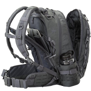 Der Rucksack ist aus einer Kombination aus Cordura® 500D und lasergeschnittenem Laminat gefertigt. Der Rucksack hat zwei Taschen für das Trinksystem - eine interne und eine externe, die mit einem Reissverschluss im Rückenteil versehen ist. Die Rückentasche kann dank der Verwendung von weichem Schaumstoff auch zum Tragen von Tablets oder bis zu 15 " Laptops verwendet werden. Im Inneren des Hauptfachs befindet sich ein Netzfach mit Reissverschluss für kleine Gegenstände. Das vordere Fach ist mit einem Organizer ausgestattet, mit dem Sie Ihre Ausrüstung, einschliesslich kleiner Funkgeräte, organisieren können. An den Seiten des Rucksacks befinden sich Taschen für Wasserflaschen oder kleine Gegenstände. An der Vorderseite hat der Rucksack ein zusätzliches, kleines, mit weichem Velours gefüttertes Fach, in dem Sie die Sonnenbrille sicher transportieren können, ohne Angst zu haben, dass sie zerkratzt wird. An der Vorderseite befindet sich ausserdem ein weicher Klettverschluss zur einfachen Personalisierung. Die Vorderseite, die Seiten des Rucksacks und der Hüftgurt sind teilweise mit einem lasergeschnittenen modularen System bedeckt, das mit MOLLE / PALS kompatibel ist. Der Zuggriff des Rucksacks ist aus Paracord gefertigt. Im Notfall kann dieser Griff entwirrt werden, so dass insgesamt 5,5 m Leine zur Verfügung stehen. Profilierte Schultergurte und ein abnehmbarer Hüftgurt garantieren ein stabiles Tragen des Rucksacks, auch bei dynamischen Aktivitäten. Der Hüftgurt kann separat verwendet werden, mit einem zusätzlichen Paar leichter Schultergurte, die im Set enthalten sind.