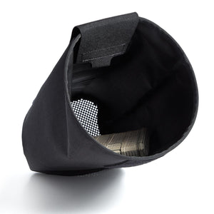 Der abriebfeste und wasserabweisende Abwurfsack misst stolze 27 cm in der Höhe und an die 15 cm im Durchmesser. Dadurch finden ca. neun 5.56 Magazine ihren Platz im Inneren des Dump Pouches. Im gleichen Zug ist der Pouch aber auch auf 13×13 cm zusammen faltbar, falls Du ihn gerade nicht benötigst – grosses Fassungsvermögen trifft auf kleines Packmass! Eine eingearbeitete Versteifung am oberen Rand hält den Pouch beim Beladen offen, sodass ein Einfallen des Sacks verhindert wird. Am Boden begünstigt das robuste Netzgewebe das Abfliessen von Wasser, Sand oder ähnlich kleinen Partikeln, die mit in den Sack geraten sind. Die Rückseite mit PALS-Schlaufen ermöglicht eine Befestigung über das MOLLE-System. Zusätzliche Schlitze auf der Rückseite erlauben die Aufnahme direkt an 45 mm breiten Gürteln.