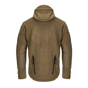 Die Patriot Heavy Fleece Jacke in der Farbe Olive Green ist für den taktischen Einsatz bei extremem Wetter konzipiert. Die Jacke verfügt über eine verstellbare Kapuze mit kleinem Visier, die zusätzlichen Schutz bietet, sowie über eine Reihe von Taschen für taktische Utensilien. Die Brusttaschen sind mit Kabelösen und Fächern für kleine Geräte ausgestattet. Drei Aussentaschen in leicht zugänglichen Bereichen und am oberen und linken unteren Ärmel bieten zusätzlichen Stauraum. Die Ellbogen sind für zusätzliche Verschleissfestigkeit verstärkt. Die Jacke lässt sich durch mit Klettverschluss verstellbare Ärmelbündchen und elastische Kordelzüge in Kapuze und Jackenboden individuell anpassen.