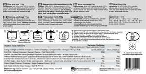Reis (42%), Schweinefleisch (15%), Karotten, Zwiebeln, Tomatenpaste (Tomaten 30%, Wasser), Zucker, Salz, Gewürze. Die Herstellung dieses Produktes erfolgt in einer Anlage, in der auch Milch-, Senf- und der Sellerie verarbeitet werden.