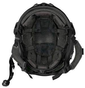 Die Innenausstattung des Schuberth Ballistikhelm M100 besteht aus einer EPP-Innenschale, einem Kopfpolster vorne mit Kopfformverstellung, einem Nackenpolster, einem Tragenetz, sowie einem 4-Punkt Kinnriemen mit Gurtbandführung und Kinnschloss. Durch das Drehen am hinteren Drehrad kann die Kopfweite eingestellt werden.