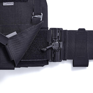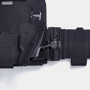 Der Elastic Cummerbund wird an der Front mittels Klett-System an den Plattenträger montiert. Das vorhandene Flausch-Klett bietet genug Halt, um die verschiedenen Placards oder Rigs sicher mit dem Plattenträger-Cummerbund-System zu verbinden. Am Anfang und am Ende vom Cummerbund befinden sich 7 cm breite Slots, ideal für kleinere Ausrüstungsgegenstände z.B. Tourniquets. Diese Einschübe sind unten geöffnet, sodass das Tourniquet auch von unten entnommen werden kann.