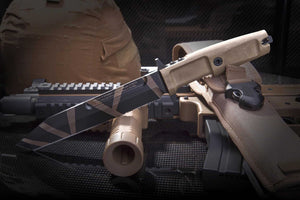 Avec une longueur totale d'environ 310 mm, une épaisseur de lame d'environ 6,3 mm et un poids d'environ 321 g, le Fulcrum Desert Warfare est à la fois puissant et maniable. Il est livré avec un étui en cordura robuste, compatible avec MOLLE/PALS, ce qui permet des options de port flexibles.