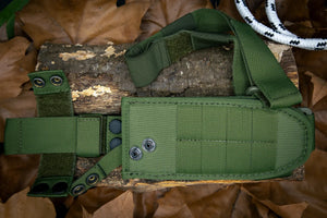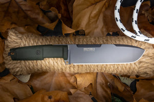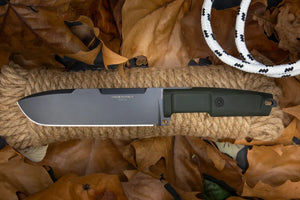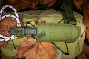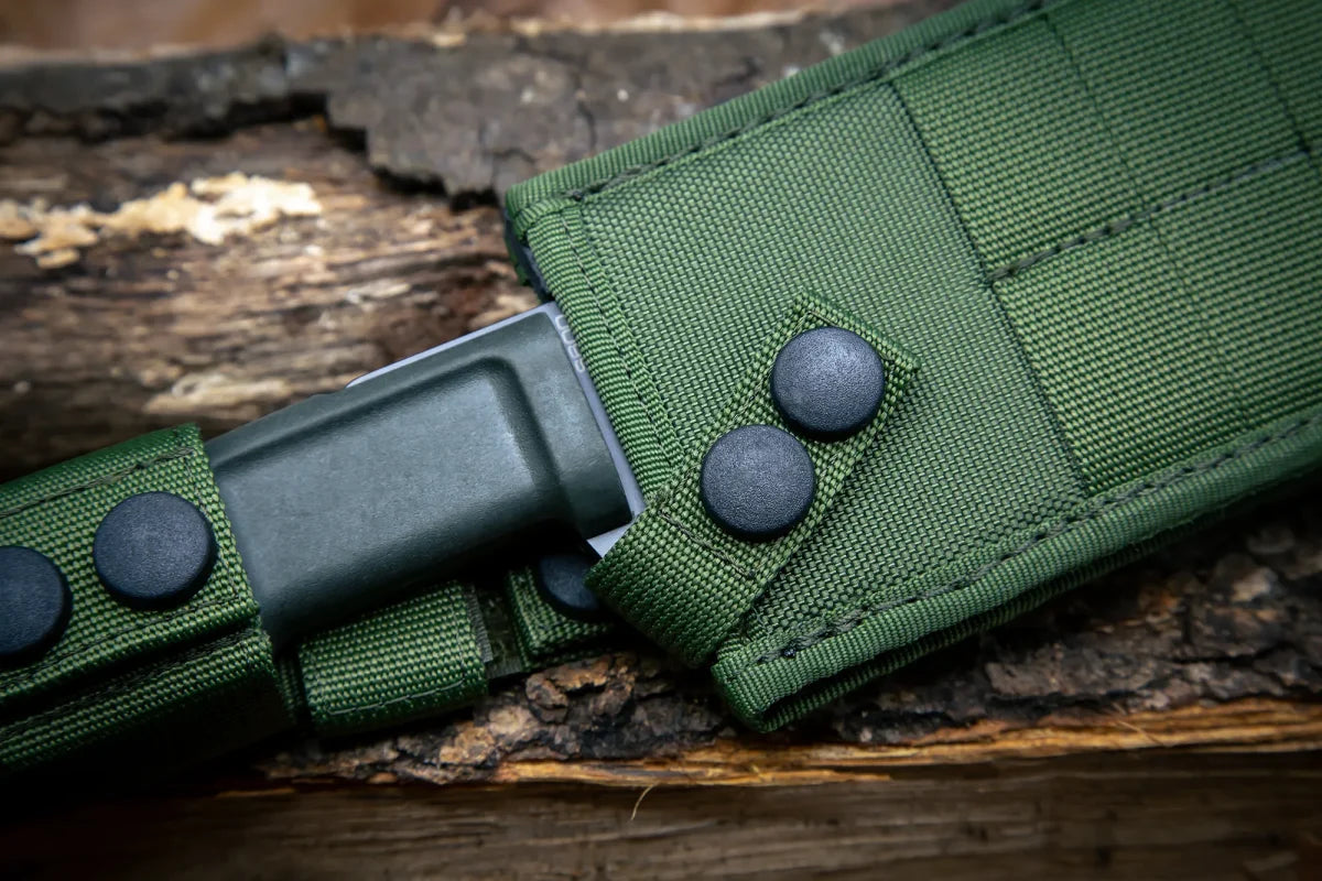 La poignée ergonomique en Forprene vert offre une prise en main sûre - même mouillée ou avec des gants - et un excellent contrôle pour toutes les tâches de coupe et de hachage. L'ensemble est complété par un étui en Cordura compatible M.O.L.L.E., qui peut être fixé de manière flexible à la ceinture ou à l'équipement.
