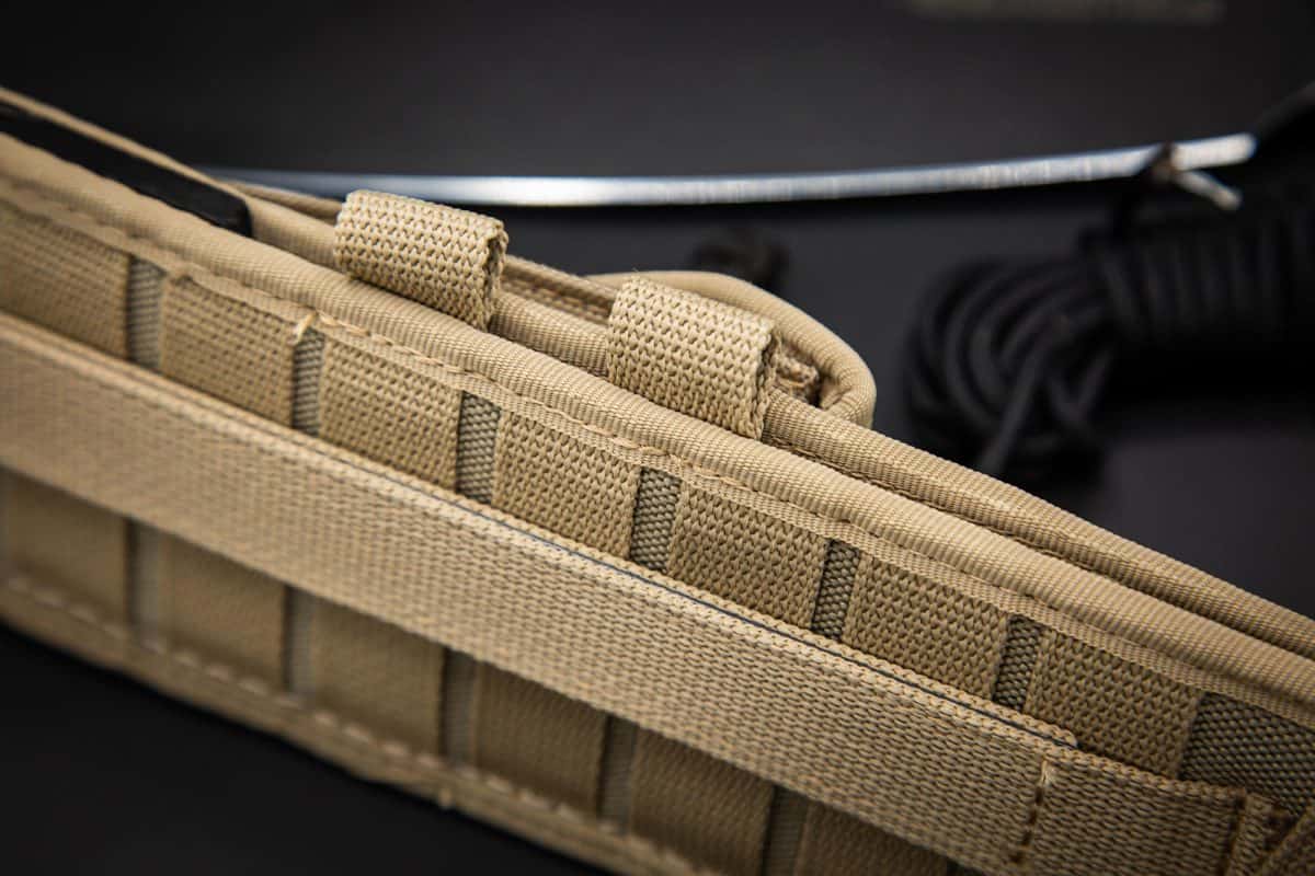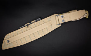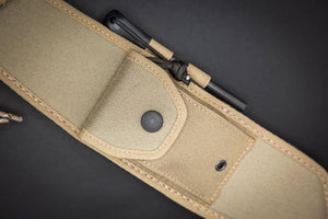Le manche est en forprène, un matériau qui offre une bonne prise en main - idéal pour une utilisation à long terme, même dans des conditions difficiles. La livraison comprend un fourreau en Cordura couleur désert avec fixation MOLLE, une bandoulière ainsi qu'une mini-poche en Paracord avec filament central inflammable et un briquet - équipé pour de véritables conditions d'expédition.