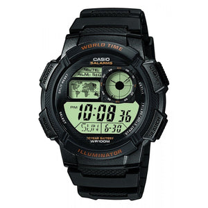 Avec une étanchéité à l'eau allant jusqu'à 10 bars (classification ISO 22810), la montre peut même être portée pour nager ou faire du surf. Le verre est fabriqué en acrylique et donc pratiquement indestructible. Le boîtier et le bracelet sont en revanche fabriqués en résine synthétique qui, grâce à ses composants synthétiques, est non seulement légère mais aussi insensible au froid ou à la chaleur tout en étant agréable à porter. La pile a une durée de vie allant jusqu'à 10 ans, la montre fonctionne donc à un niveau d'énergie extrêmement économique. Et ceux qui ne se déplacent pas seulement en Europe, mais dans le monde entier, se réjouiront de l'heure universelle : la Casio du modèle AE-1000W-1AVEF indique l'heure actuelle dans la plupart des grandes villes du monde.