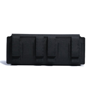 Devant la pochette se trouve une grande surface velcro qui se prolonge sur le rabat de fermeture, ce qui permet d'y fixer facilement des patchs, des identifiants ou des marquages. Un système compatible avec MOLLE est intégré au dos, ainsi que des boucles pour une fixation directe à la ceinture (pour une largeur maximale de 45 mm).