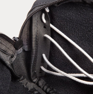 À l'intérieur , deux surfaces intérieures généreuses en velcro ainsi que des montages latéraux en shock-cord offrent des possibilités d'organisation flexibles. Grâce à l'adaptateur fourni, il est également possible de fixer en toute sécurité des objets plus grands comme des gourdes. Sur le devant se trouve une surface velcro pour les patchs et la compatibilité MOLLE permet de fixer la pochette rapidement et en toute sécurité à un sac à dos ou à un gilet.